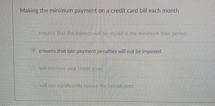 However, over the long haul, making a minimum payment has serious. This ensures that you would continue generating revenue. Making a credit card's minimum payment month after month might feel good in the short run. Credit cards help you build your credit and although making a minimal payment is better than making no payment at all, it is not a wise decision. And even paying just slightly more every month you can find the minimum payment amount clearly labelled on your credit card statement and you're required to pay it by the due date shown as part of.